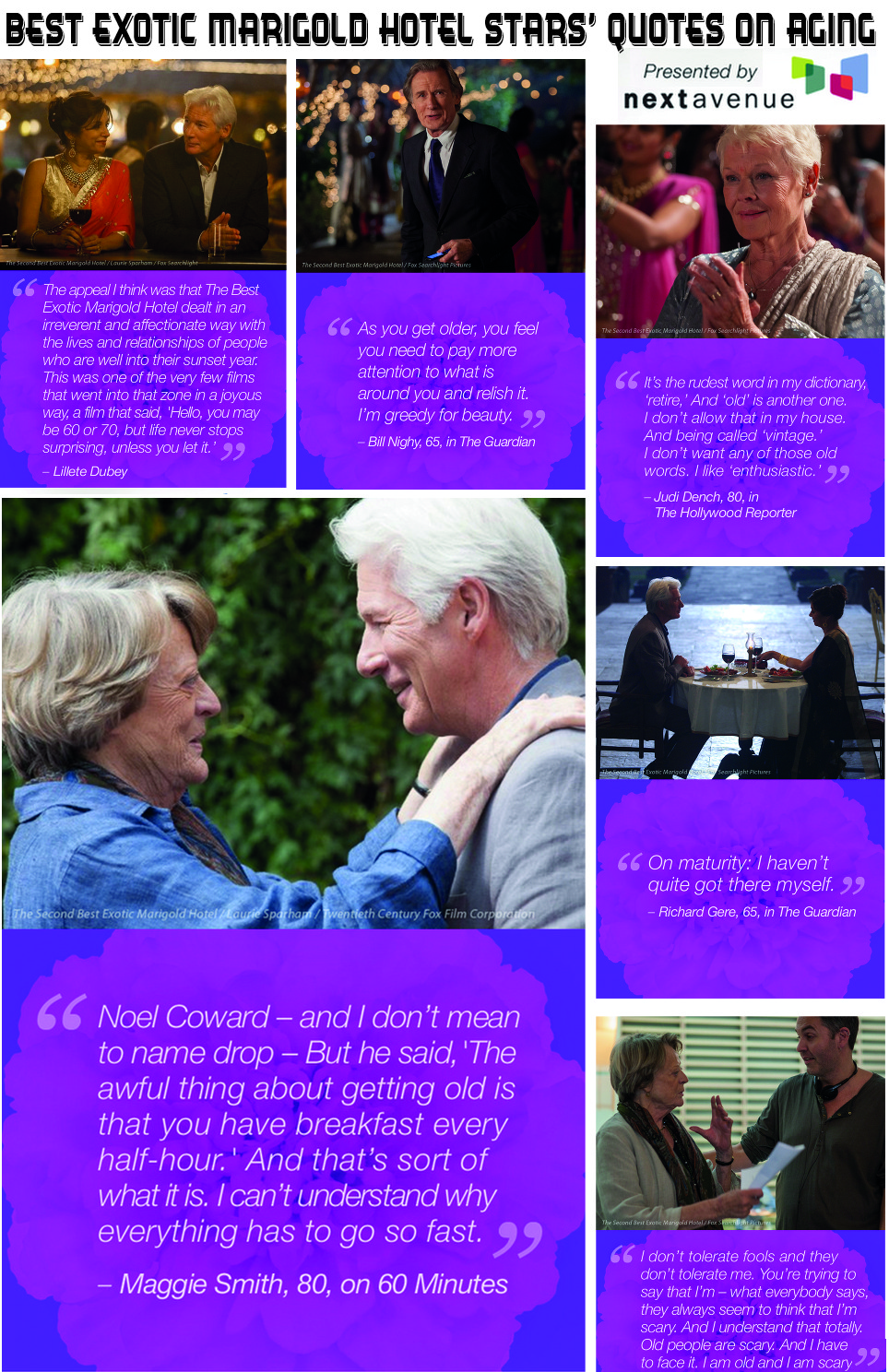 “The movie has tender, compelling moments, with themes of romance and sex and of finding life’s meaning through loss and change. The Second Best Exotic Marigold Hotel makes good use of its stars, who are strong personalities off-camera as well as on. While we wait for the film’s March 6 release, we’ve gathered some of its stars’ quotes on aging.” - NextAvenue