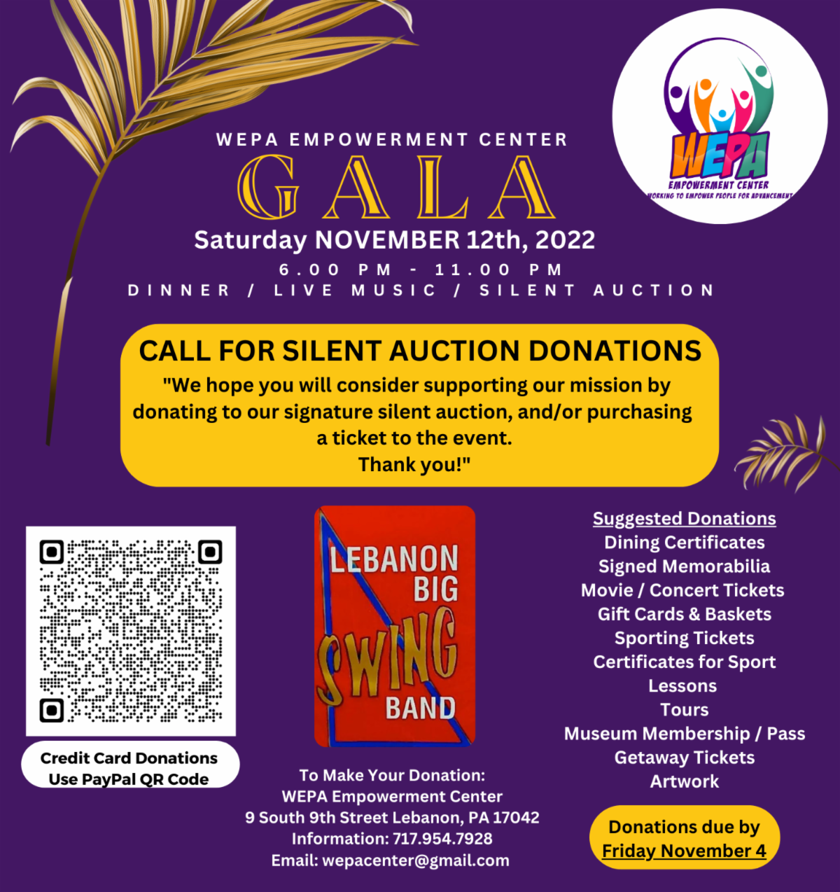 | We cordially invite you to join us for this year’s signature 2022 WEPA Gala Friendraiser! Our event is expected to draw over 200 supporters and participating businesses will be prominently featured in our event program. Join Us for a night of Dinner, Drinks and LIVE performances by Lebanon Big Swing Band and Luther Tyree. Tickets and seating is limited. Admission is $50.00 per person. You make use the PayPal QR code to purchase your tickets and make donations payable to WEPA Empowerment Center. WEPA is a registered 501(c)(3) organization and all donations to the center are tax-deductible to the extent of the law. Outreach: WEPA has reached over 11,200 individuals within the last 90 days.Our followers: 72% women ages 25-54. One of our latest posted picture reached 6,600 individuals in Lebanon County. As a silent auction donor and sponsor of the event, you’ll be featured in our program promotion, and prominently displayed at our social media outlets for individuals to see. Our Sponsorship Packages range from $500 - $5,000. We hope you will consider supporting our mission by purchasing a sponsorship package, donate to our silent auction, and/or purchase a ticket to the event. For more information: Call 717.954.7928 or email us at wepacenter@gmail.com Kind regards,Rafael |