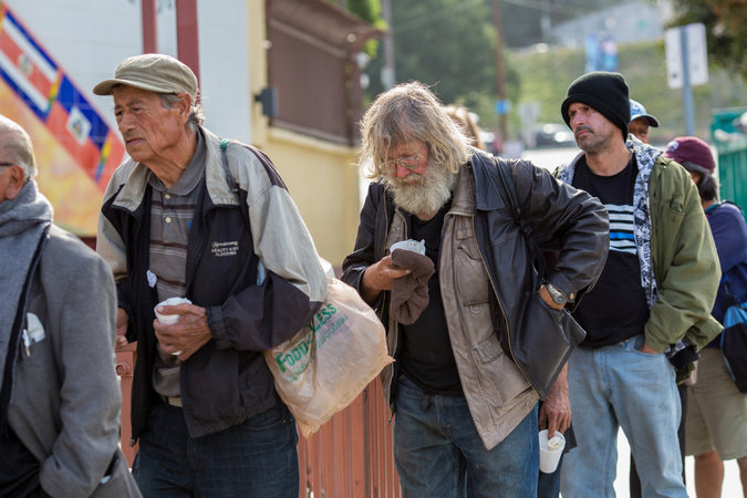 Homeless men lined up for food being given out this month in downtown Los Angeles. Many of the nation’s poor have long flocked to Skid Row, drawn by a year-round temperate climate and a cluster of missions and clinics. Credit Monica Almeida/The New York Times